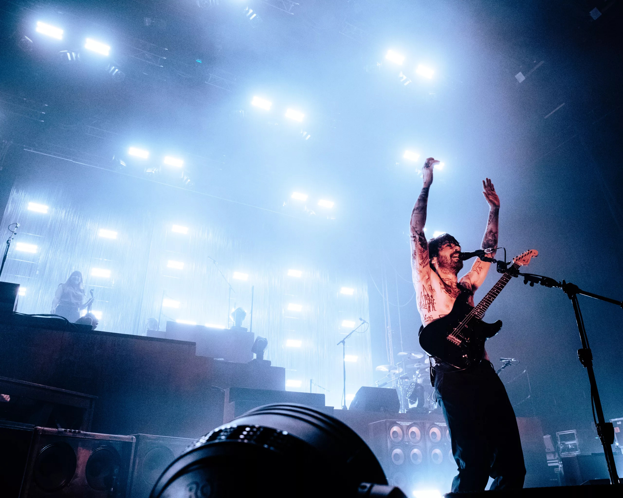Dans cette atmosphère de confiance et de vulnérabilité assumée, la scène est prête à accueillir Biffy Clyro. Paris et le groupe écossais partagent une histoire écrite à l’encre indélébile. Plus de vingt ans de fidélité, quatre Olympias, et toujours cette même sensation : ici, ils jouent comme chez eux. Le public le sait, le groupe le sait. On se retrouve comme on retrouve des amis de longue date, ceux avec qui le temps ne fait que renforcer les liens. Mais cette date porte une nuance particulière