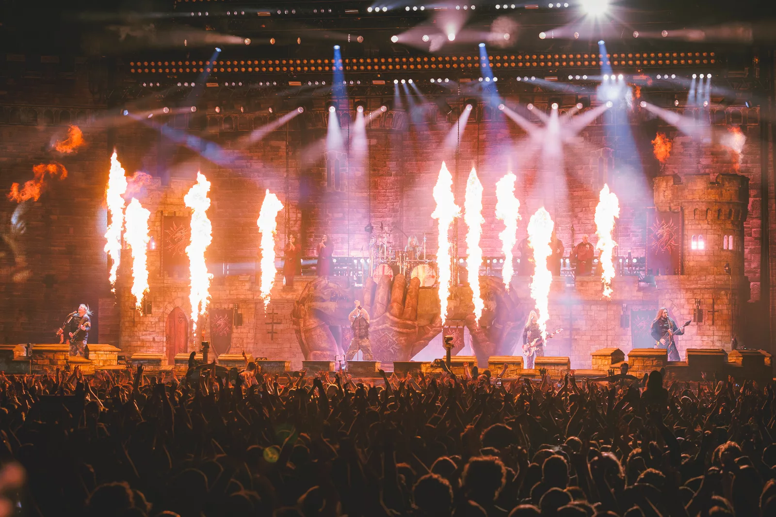 Arrivés sur la grande scène, ils ont lancé “Templars”, ouverture martiale qui prolongeait l’esthétique de leur entrée. Puis, sans laisser retomber la tension, “The Last Stand” a transformé l’arène en champ de bataille imaginaire. Les flammes jaillissaient en colonnes, les stroboscopes crépitaient, et la fosse devenait un océan de bras levés.